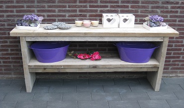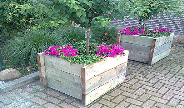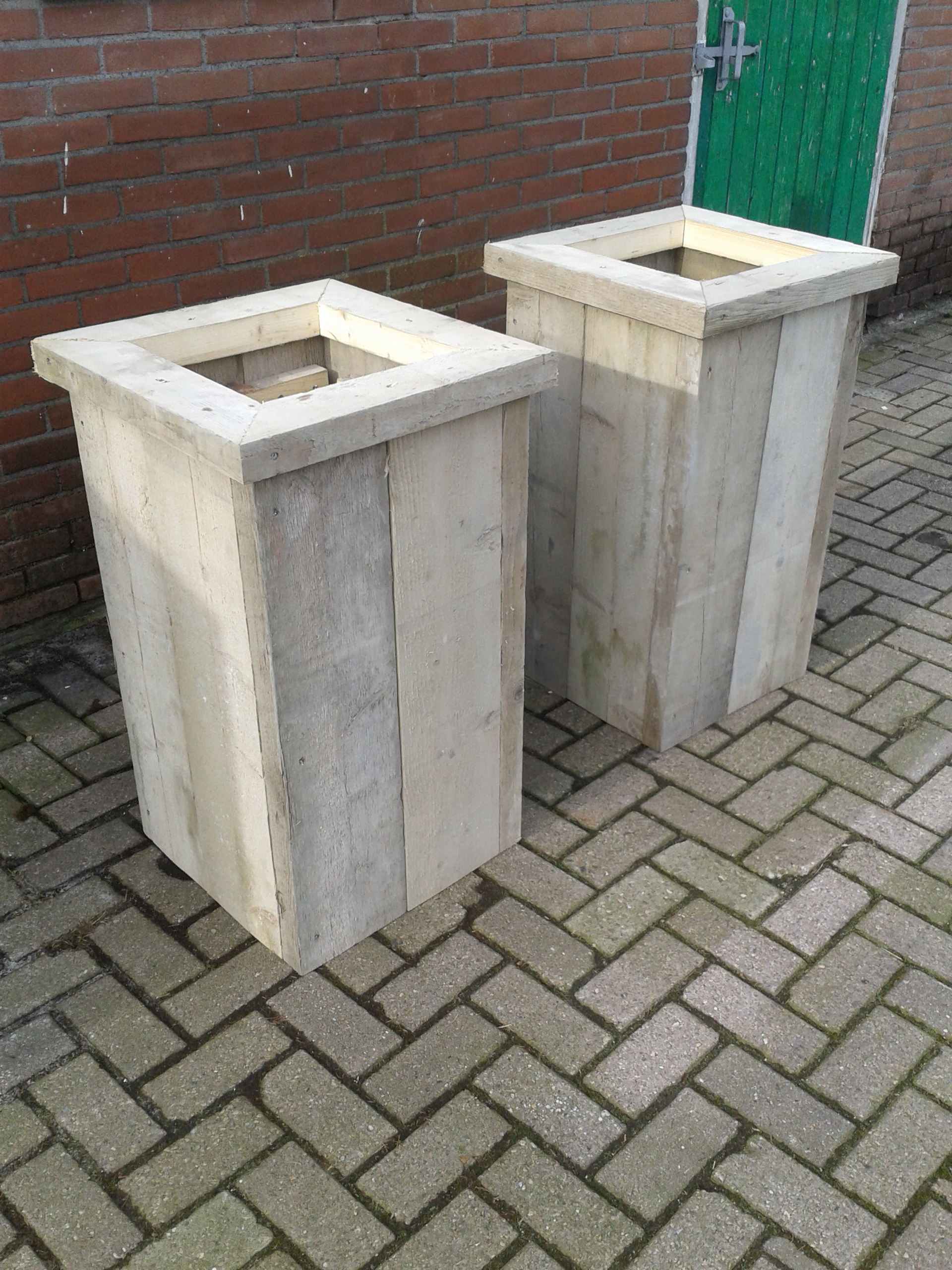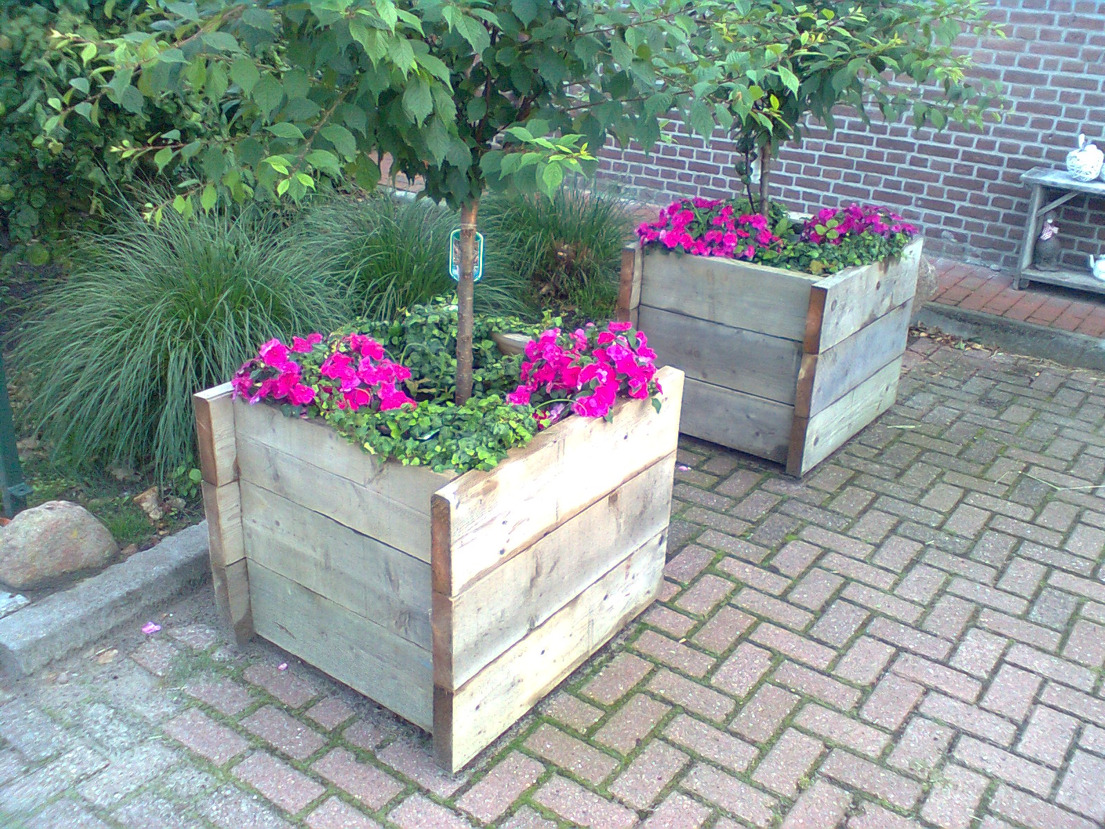 Stijlvolle bloembakken gemaakt van steigerhout.